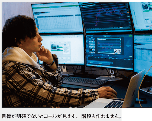 フェラーリを購入するにはローンが必要で、ローンを組むには収入をどのくらい上げる必要があり、そのためには転職や副業をして収入を上げるなど、目標を達成するためには何をしなければいけないのかが見えてきます。僕の場合は、レバレッジを活用できて、少ない元手でも大きく稼げるFXが効率的と考えました。まずは目標を明確にし、明確にした目標を数値化して、それを逆算しつつ階段を組み立て、一段ずつ階段を登っていきながら、成功体験を積み重ねていくことが大切です。目標が明確でないとゴールが見えないので、階段も作れないです。