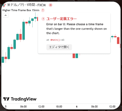 表示しているローソク足よりも長い期間を指定しないとエラーになります。例えば、月足チャートを表示しているときに、上位足ボックスの期間を1週間や2週間にするとエラーとなります。TradingViewのルールに従い、エラーメッセージは英語で表示されます。ローソク足の色は  色選択アイコンからカラーピッカーを表示して選択することができます。
