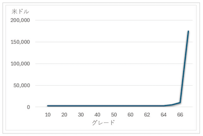 図2のグラフを見ると、グレードと価格は正比例の関係でないことがわかります。64くらいまでほぼ横ばいで推移し、66付近から急激に上昇しています。直線的でない理由は、自分でコインを買う場面を想像してみると分かりやすいです。傷だらけのコインはたくさん現存しており、ピカピカのコインはわずかしかありません。コレクション用でも投資目的でも、ピカピカで希少価値が高いほうが欲しいでしょう。これが価格に反映されています。