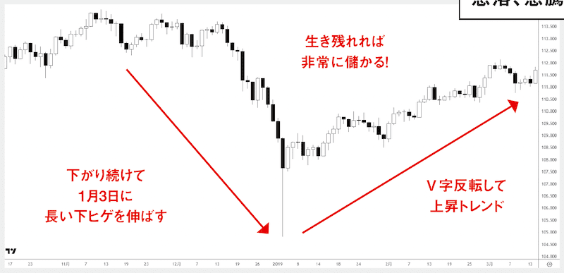 上のチャートは、2019年お正月に発生したアップルショック時のドル円日足。年末からすでに下降トレンドで、年明けに買方が踏ん張りきれず総崩れし、大きく下げるも数時間で反転、長い下ヒゲを伸ばして上昇トレンドに転じました。この動きがあったのが早朝で、多くの方が起床後に衝撃を受けたはず。買い運用でこういった値動きを耐え切れれば、大量の利益確定が実現します。もちろん耐え切れなければ、口座は破綻しますが。