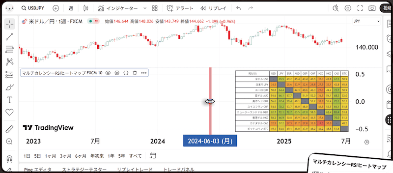 自分が普段トレードしている通貨ペアだけでなく、他の通貨の動きにも目を向け、相場全体の流れを把握することはとても重要です。「マルチカレンシーRSIヒートマップ」は、TradingViewのチャート上に表示することで、複数通貨の強弱を色で可視化し、一目で相場全体を俯瞰できるインジケーターです。通貨の強弱はRSIを用いて判定します。
